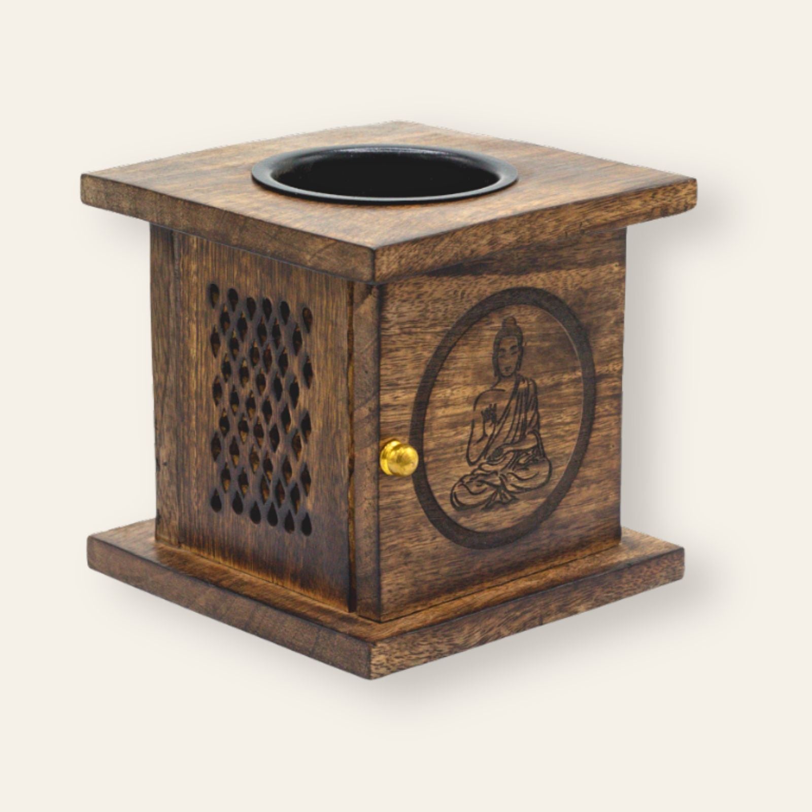 Handcrafted oil burner made of natural mango wood with an engraving of the Buddha.