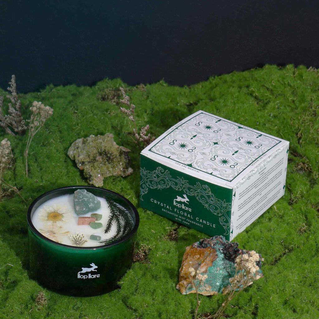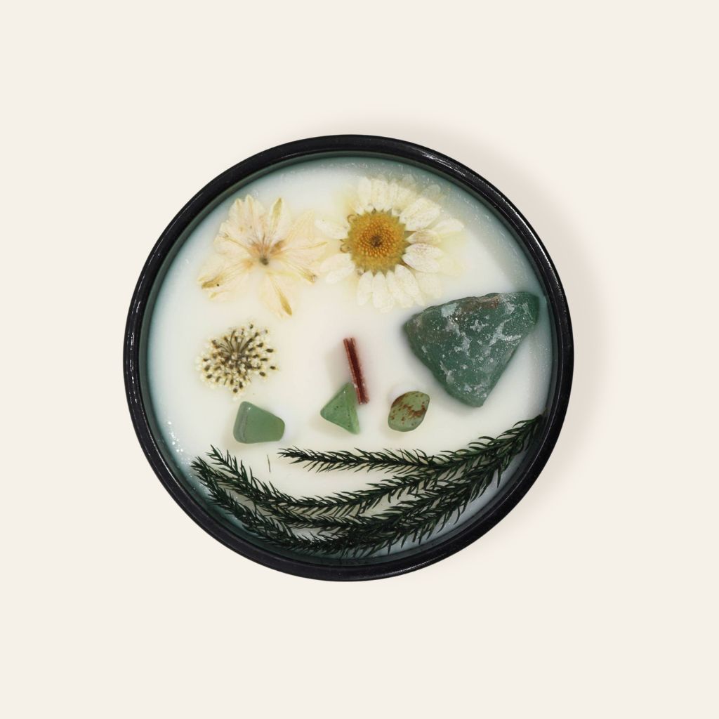 Enclosed in an elegant recycled green glass with a wooden wick, each candle is a unique piece, embellished with dried flowers and crystals waiting to be discovered.