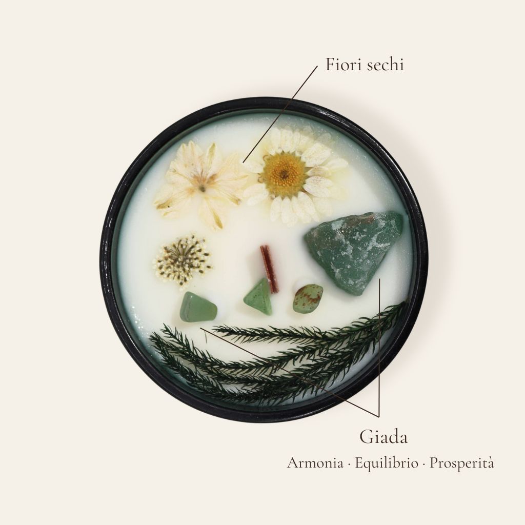 Its fresh, minty fragrance purifies the air and creates an atmosphere of calm and clarity, ideal when you want to regain focus and breathe. Enriched with jade, it invites balance and emotional harmony: a stone symbolizing serenity, perfect for transforming your space into a small sanctuary.