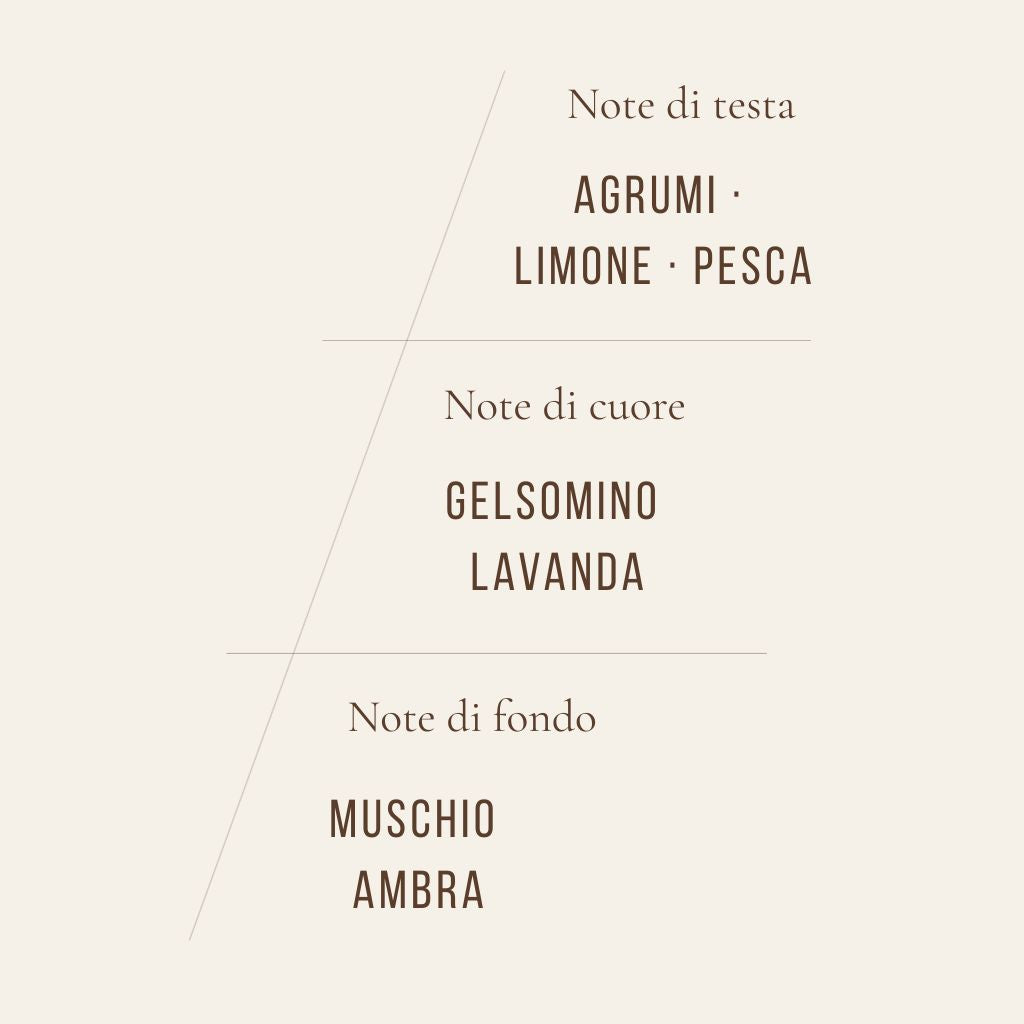 A bright and refined fragrance that opens with the vibrant freshness of citrus fruits, lemon and a sweet hint of peach, intertwining with a floral heart of jasmine and lavender and settling on a soft and enveloping base of musk and amber.