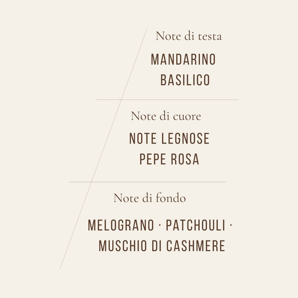 A vibrant and sophisticated fragrance that opens with the luminous freshness of mandarin and the aromatic note of basil, evolves into a spicy heart of pink pepper and woody accords and settles on an enveloping base of pomegranate, patchouli and cashmere musk.