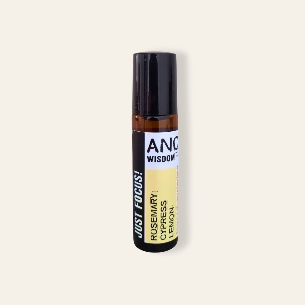 Just Focus, 10ml. A blend of pure rosemary, cypress, and lemon essential oils, diluted in vegetable oil, designed to help you achieve a sense of mental clarity, concentration, and clarity.