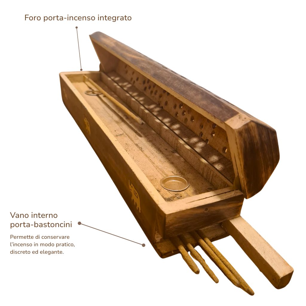 È inoltre dotato di un vano interno porta-bastoncini, che consente di conservare l’incenso in modo pratico e discreto.