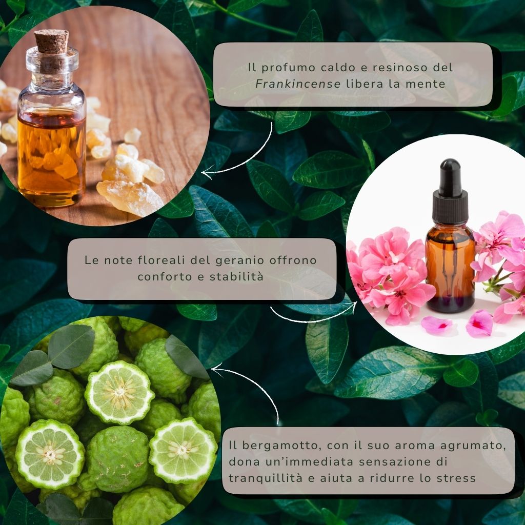 Olio di germe di Triticum Vulgare, tocoferolo, olio di Citrus Bergamia, olio di Pelargonium Graveloens, olio di Boswellia Carterii, limonene*, linalolo*, citronellolo*, geraniolo*, citrale*. *Naturalmente presente negli oli essenziali