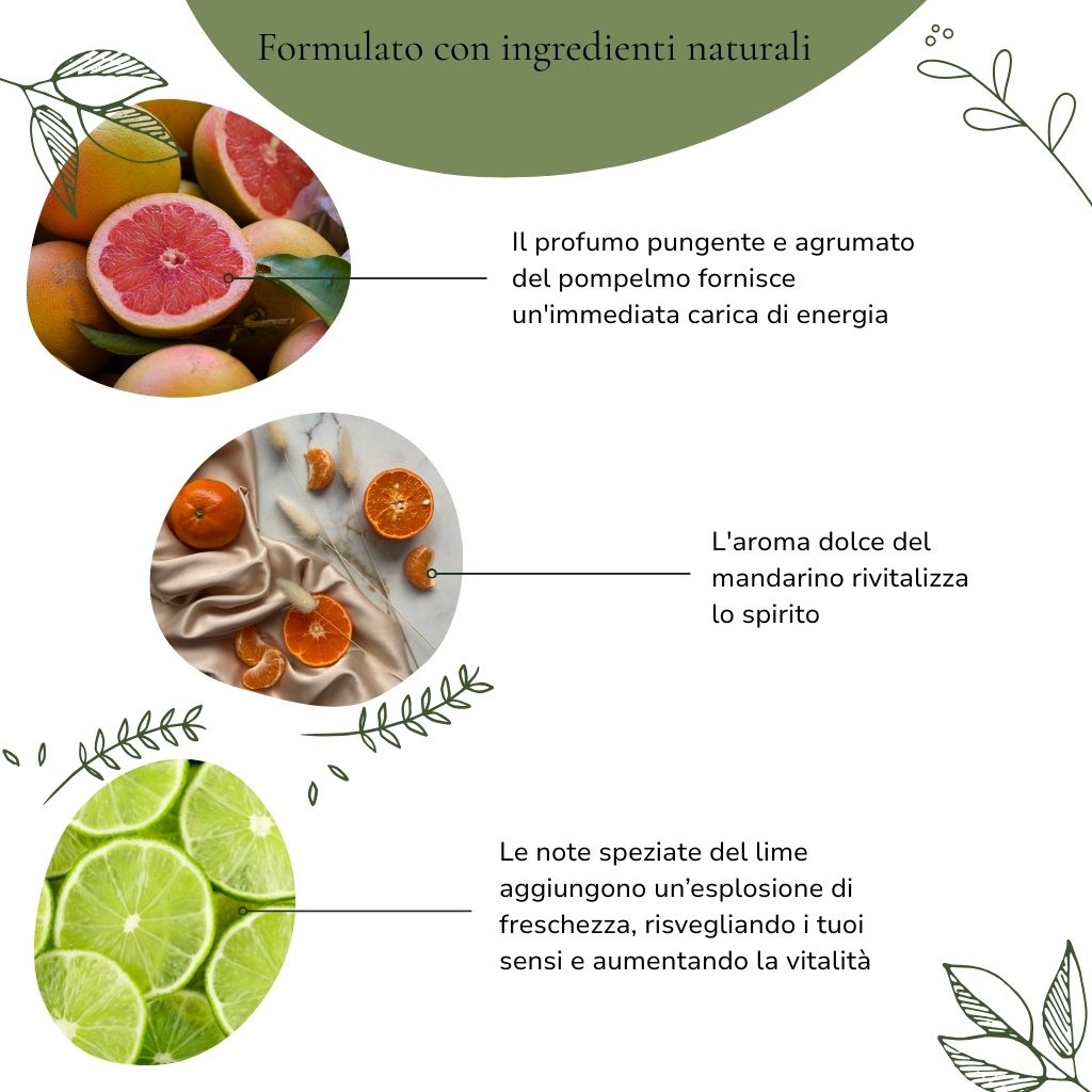 Rinvigorisci i tuoi sensi e ritrova vitalità con ENERGY, il blend di oli essenziali a base di pompelmo, mandarino e lime, formulato per ricaricare corpo e mente.